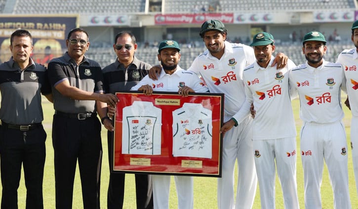 শুরুতে তাকে বিশেষ টেস্ট ক্যাপ তুলে দেন হাবিবুল বাশার। যিনি ২০০৫ সালে লর্ডসে মুশফিকের হাতে প্রথম টেস্ট ক্যাপ তুলে দিয়েছিলেন। এরপর ক্যাপের বিশেষ কেসকেট প্রদান করেন বাংলাদেশের প্রথম টেস্ট ক্রিকেটার আকরাম খান। এরপর বিশেষ ক্রেস্ট তুলে দেন বাংলাদেশের প্রথম টেস্ট সেঞ্চুরিয়ান ও বর্তমান বিসিবি সভাপতি আমিনুল ইসলাম বুলবুল, সঙ্গে ছিলেন নাজমুল আবেদীন ফাহিম।