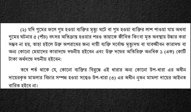 ৬ নভেম্বর প্রধান উপদেষ্টার প্রেস সচিব শফিকুল আলম জানিয়েছিলেন, গুমের সর্বোচ্চ সাজা মৃত্যুদণ্ড রেখে অধ্যাদেশের খসড়া অনুমোদন দিয়েছে উপদেষ্টা পরিষদ। সেই অধ্যাদেশ সোমবার রাতে প্রকাশ করা হলো।