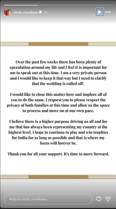 অনুরোধ করে স্মৃতি মান্ধানা বলেন, “বিয়ের প্রসঙ্গটি এখানেই শেষ করতে চাই। সবাইকে অনুরোধ করছি, এই সময়ে উভয় পরিবারের গোপনীয়তাকে সম্মান করুন। আমাদের নিজেদের মতো করে বিষয়টি সামলে সামনে এগিয়ে যেতে কিছুটা সময় দিন।”