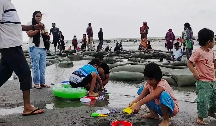 সৈকতের বালিয়াড়িতে খেলায় ব্যস্ত কয়েকজন শিশু