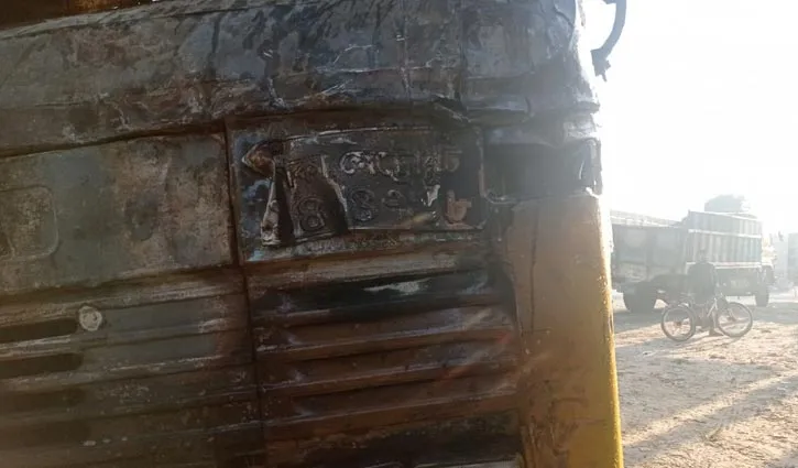 আগুনে ক্ষতিগ্রস্ত একটি ট্রাকের সামনের অংশ