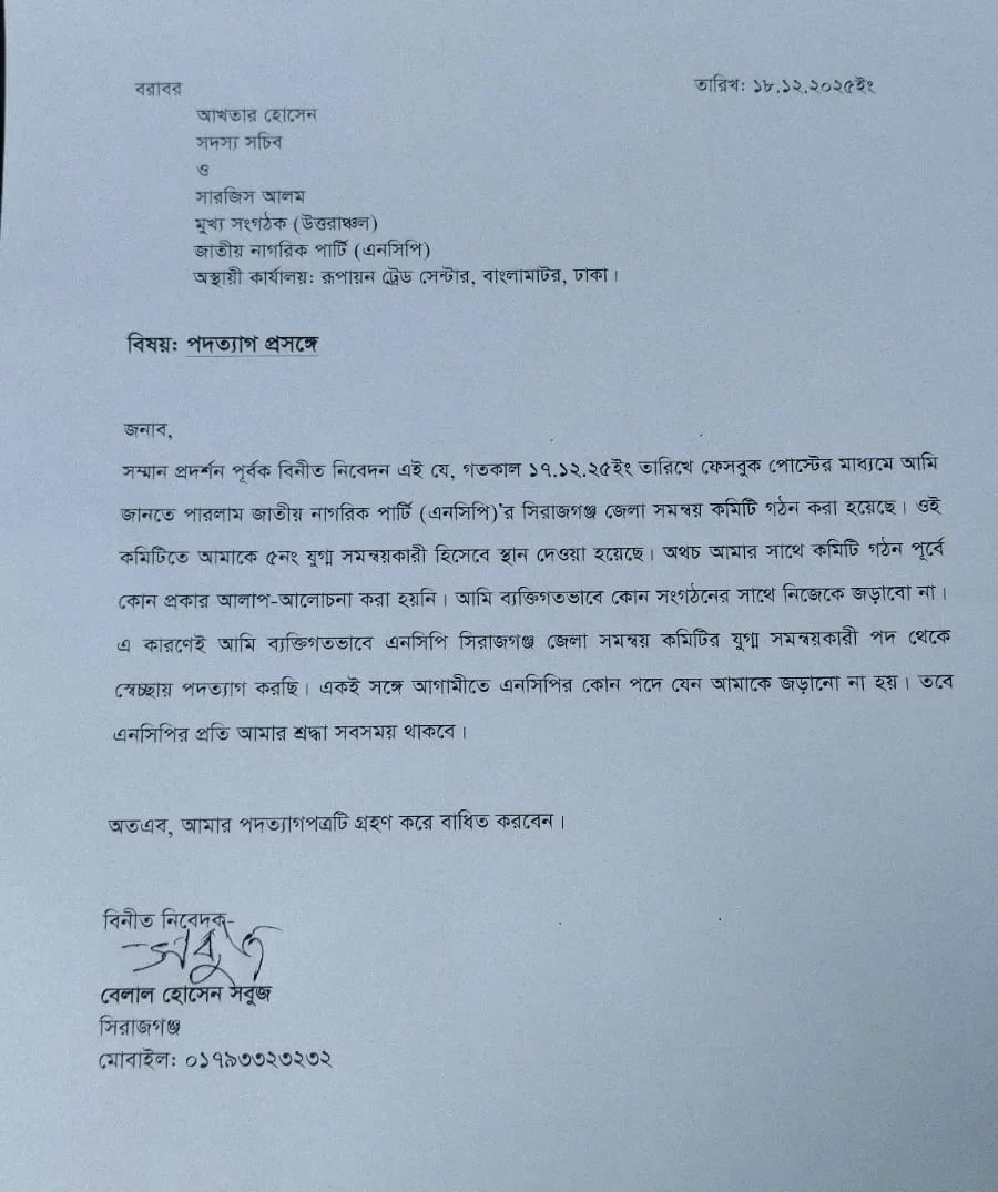 পদত্যাগপত্রে সবুজ উল্লেখ করেন, “আমি বেলাল হোসেন সবুজ সিরাজগঞ্জে বৈষম্যবিরোধী ছাত্র আন্দোলনে নেতৃত্ব দিয়েছি। সম্প্রতি সময়ে এনসিপির কেন্দ্রীয় নেতৃবৃন্দ যখনই সিরাজগঞ্জ আসতেন, তখনই আমাকে ডাকতেন। আমি ব্যবসার পাশাপাশি তাদের সঙ্গে সময় দিতাম। তাদের কর্মকাণ্ডে বেকআপ দিতাম। গতকাল বুধবার (১৭ ডিসেম্বর) গভীর রাতে আমি ফেসবুক পোস্টে দেখলাম সিরাজগঞ্জে এনসিপির সমন্বয় কমিটি গঠন করা হয়েছে। সেই কমিটিতে আমাকে অবগত না করে ৫ নম্বর যুগ্ম সমন্বয়কারী পদে রেখে কমিটি ঘোষণা করা হয়েছে।”