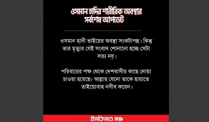 বার্তায় বলা হয়েছে, ওসমান হাদি ভাইয়ের অবস্থা সংকটাপন্ন, তবে তার মৃত্যুর যে সংবাদ শোনানো হচ্ছে, তা সত্য নয়।