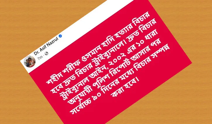 নিজস্ব প্রতিবেদক || পুলিশ রিপোর্ট আসার পর সর্বোচ্চ ৯০ দিনের মধ্যে ইনকিলাব মঞ্চের মুখপাত্র ও জুলাইযোদ্ধা শরিফ ওসমান হাদিকে হত্যার বিচার সম্পন্ন করা হবে বলে জানিয়েছেন আইন, বিচার ও সংসদ বিষয়ক উপদেষ্টা ড. আসিফ নজরুল।