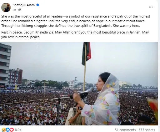 শোক জানিয়ে ফেসবুকে পোস্ট দিয়েছেন প্রধান উপদেষ্টার প্রেস সচিব শফিকুল আলম। তিনি লেখেন, ‍“তিনি ছিলেন সব নেতার মধ্যে সবচেয়ে করুণাময় – আমাদের প্রতিরোধের প্রতীক এবং সর্বোচ্চ স্তরের একজন দেশপ্রেমিক। তিনি শেষ অবধি একজন যোদ্ধা ছিলেন। আমাদের সবচেয়ে কঠিন সময়ে আশার আলো। আজীবন সংগ্রামের মাধ্যমে তিনি বাংলাদেশের প্রকৃত চেতনাকে সংজ্ঞায়িত করেছেন। তিনি ছিলেন আমার নায়ক।”
