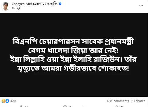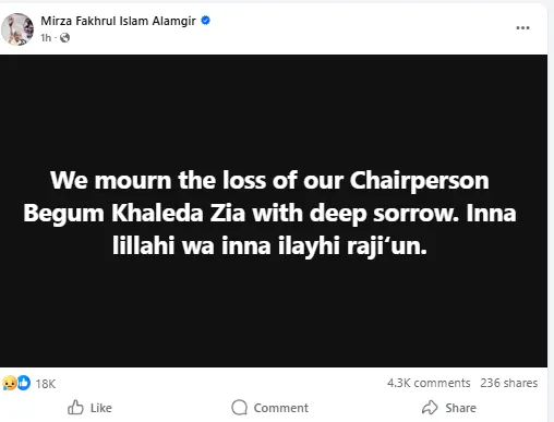 নিজের ফেসবুক পোস্টে বিএনপি মহাসচিব মির্জা ফখরুল ইসলাম আলমগীর লেখেন, “আমরা গভীর দুঃখের সঙ্গে আমাদের চেয়ারপারসন বেগম খালেদা জিয়ার মৃত্যুতে শোকাহত (ইন্না লিল্লাহি ওয়া ইন্না ইলাইহি রাজিউন)।”
