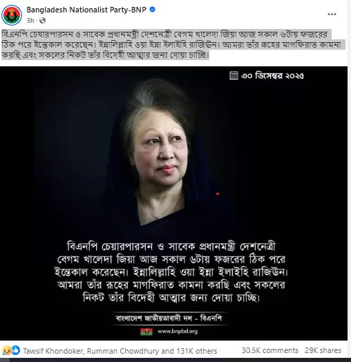 বিএনপির ভেরিফাইড ফেসবুক পেজে খালেদা জিয়ার মৃত্যুর তথ্য জানিয়ে লেখা হয়, “বিএনপি চেয়ারপারসন ও সাবেক প্রধানমন্ত্রী দেশনেত্রী বেগম খালেদা জিয়া আজ সকাল ৬টায় ফজরের ঠিক পরে ইন্তেকাল করেছেন। ইন্নালিল্লাহি ওয়া ইন্না ইলাইহি রাজিঊন। আমরা তাঁর রূহের মাগফিরাত কামনা করছি এবং সকলের নিকট তাঁর বিদেহী আত্মার জন্য দোয়া চাচ্ছি।”