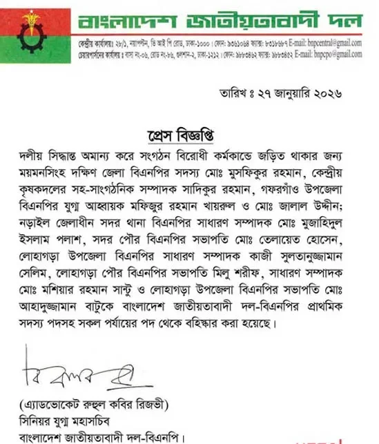 বিজ্ঞপ্তিতে জানানো হয়,সংশ্লিষ্ট সবার অবগতির জন্য জানানো যাচ্ছে যে, সংগঠন বিরোধী কর্মকাণ্ডে জড়িত থাকার জন্য নড়াইল জেলাধীন প্রেস বিজ্ঞপ্তিত উল্লেখিত নেতাদের বাংলাদেশ জাতীয়তাবাদী দল-বিএনপির প্রাথমিক সদস্য পদসহ সব পর্যায়ের পদ থেকে বহিষ্কার করা হয়েছে। এ আদেশ অবিলম্বে কার্যকর হবে।