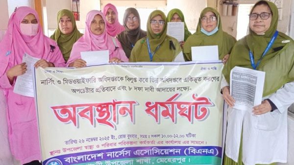 মেহেরপুর প্রতিনিধি || আট দাবিতে অবস্থান ধর্মঘট ও দুই ঘণ্টা কর্মবিরতি পালন করেছেন মেহেরপুরের গাংনী উপজেলা স্বাস্থ্য কমপ্লেক্সের সিনিয়র স্টাফ নার্স ও মিডওয়াইফারি কর্মকর্তারা। বুধবার (২৬ নভেম্বর) সকাল ১০টা থেকে দুপুর