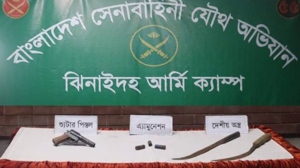 ঝিনাইদহ প্রতিনিধি || ঝিনাইদহের কালীগঞ্জে অভিযান চালিয়ে পরিত্যক্ত অবস্থায় পিস্তল, গুলি ও দেশীয় অস্ত্র উদ্ধার করা হয়েছে। উদ্ধারকৃত পিস্তলে লেখা রয়েছে, মেইড ইন ইন্ডিয়া। রবিবার (২৩ নভেম্বর) দিবাগত রাতে উপজেলার