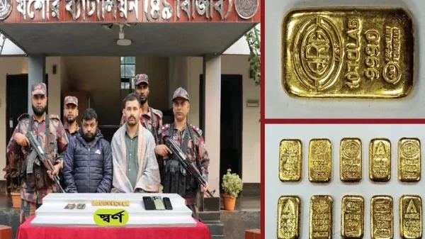 যশোর প্রতিনিধি || যশোরে ১০ পিস স্বর্ণের বারসহ দুই পাচারকারীকে আটক করেছে বর্ডার গার্ড বাংলাদেশ (বিজিবি।) বৃহস্পতিবার (৪ ডিসেম্বর) ভোর সাড়ে ৫টার দিকে সদর উপজেলার মুরাদগড় বাসস্ট্যান্ড এলাকা থেকে আটকের পর তাদের