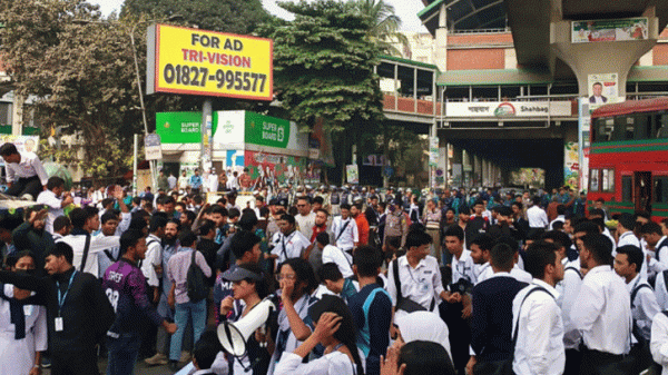 নিজস্ব প্রতিবেদক || প্রস্তাবিত ঢাকা সেন্ট্রাল ইউনিভার্সিটি অধ্যাদেশের খসড়া থেকে ‘স্কুলিং পদ্ধতি’ বাদ দেওয়ার দাবিতে শাহবাগে সড়ক অবরোধ করেন পাঁচ কলেজের শিক্ষার্থীরা। রবিবার (৭ ডিসেম্বর) দুপুর পৌনে ১২টার দিকে সড়ক অবরোধ