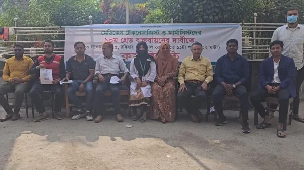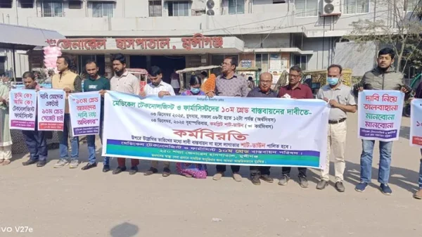 মুন্সীগঞ্জ প্রতিনিধি || মুন্সীগঞ্জে দশম গ্রেড বাস্তবায়নের দাবিতে কর্মবিরতি পালন করেছেন মেডিকেল টেকনোলজিস্ট ও ফার্মাসিস্টরা। বৃহস্পতিবার (৪ ডিসেম্বর) সকাল ৮টা থেকে দুপুর ১২টা পর্যন্ত মুন্সীগঞ্জ ২৫০ শয্যাবিশিষ্ট জেনারেল হাসপাতাল প্রাঙ্গণে এ